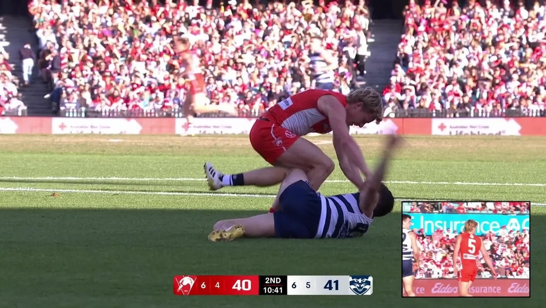 Nick Blakey was critical to the Swans' fast start as his pace and penetrating kicking when dashing off half-back opened up the Cats through the centre of the field. He set off on one of his darting runs halfway through the opening term but was brought to a grinding halt with a strong bump from emerging Cats defender Connor O'Sullivan. The transition still ended with Braeden Campbell booting the Swans' third goal, but Blakey took time to get back to his feet and had to be helped from the field. The 'Lizard' was back up and running shortly after, and returned to be an influential figure in his 150th match even as the Swans were gradually overrun.